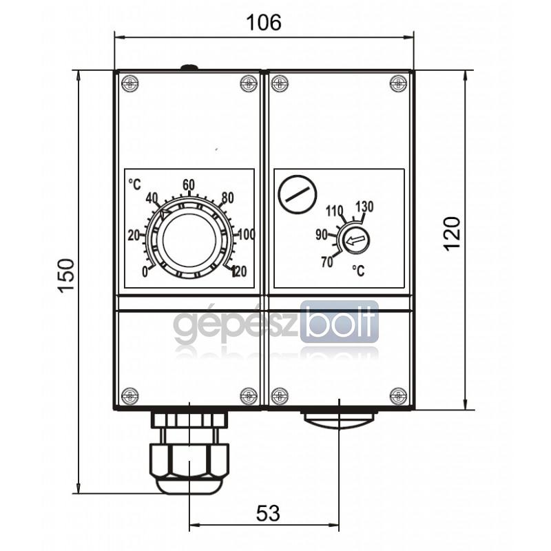 Szabályozó termosztát (TR) és biztonsági határoló termosztát (STB) kombinációja. Belső skála (TR), belső skála (STB), 2 váltó kontaktus, hibamentes kapilláris cső, STB környezeti hőmérséklet kompenzációval. Merülő termosztát illetve fali szerelés.